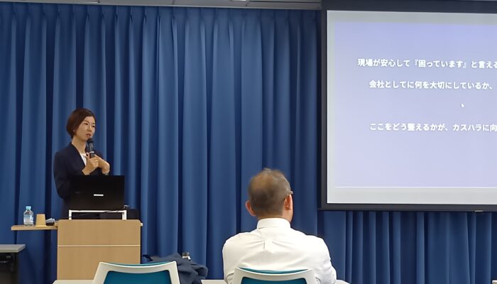 プレゼンセミナータイトル『接遇とカスハラから考える 組織の在り方について』〜カスハラに負けない!現場で役立つ対応力と本部のサポート体制〜というテーマでお話をさせていただきました。