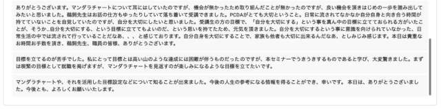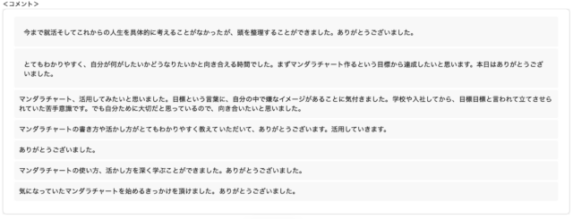 また、終了後のアンケートでは、通常よりも多くのコメントやご感想をいただきました。OSAKAしごとフィールドのご担当者様からも「ここまで反応が多いのは珍しい」とのお言葉をいただき、参加者の皆さまの関心の高さを改めて実感いたしました。
